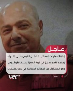 🔴 عاجل | إدارة العمليات العسكرية تعلن القبض على اللواء (محمد كنجو حسن) في خربة المعزة بريف طرطوس وهو المسؤول عن المحاكم الميداني ة في سجن صيدنايا العسكري. لتكملة القصة اضغط على الرقم 2 في السطر التالي