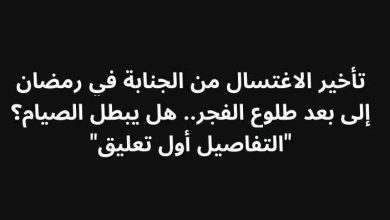 تأخير الاغتسال من الجنابة في رمضان إلى بعد طلوع الفجر.. هل يبطل الصيام؟ “التفاصيل لتكملة التفاصيل اضغط الرقم 2في السطر…